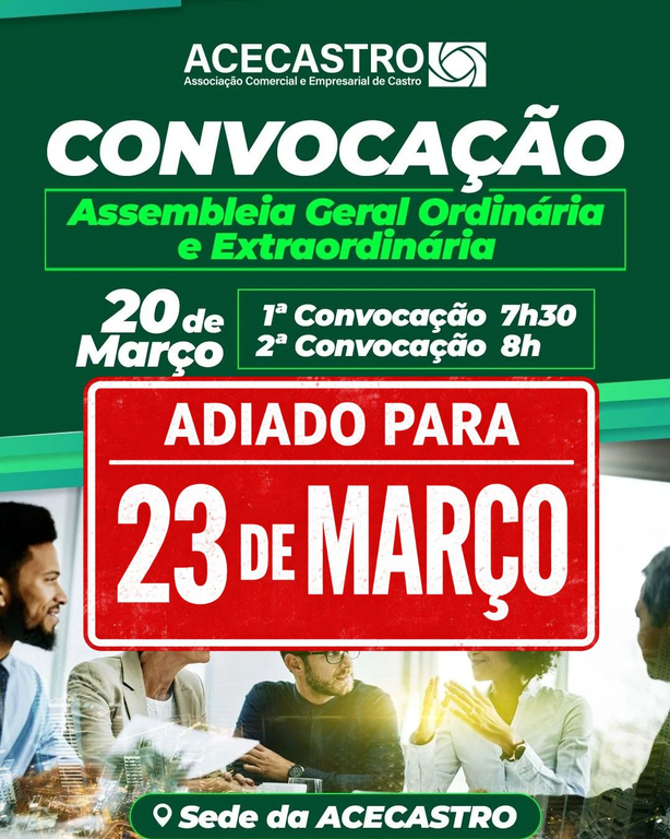 A ACECASTRO informa que, em virtude do Decreto Municipal da Prefeitura de Castro que declarou PONTO FACULTATIVO no dia 20/03/2026 (sexta-feira), a Assembleia Geral Ordinária e Extraordinária prevista para esta data foi ADIADA.