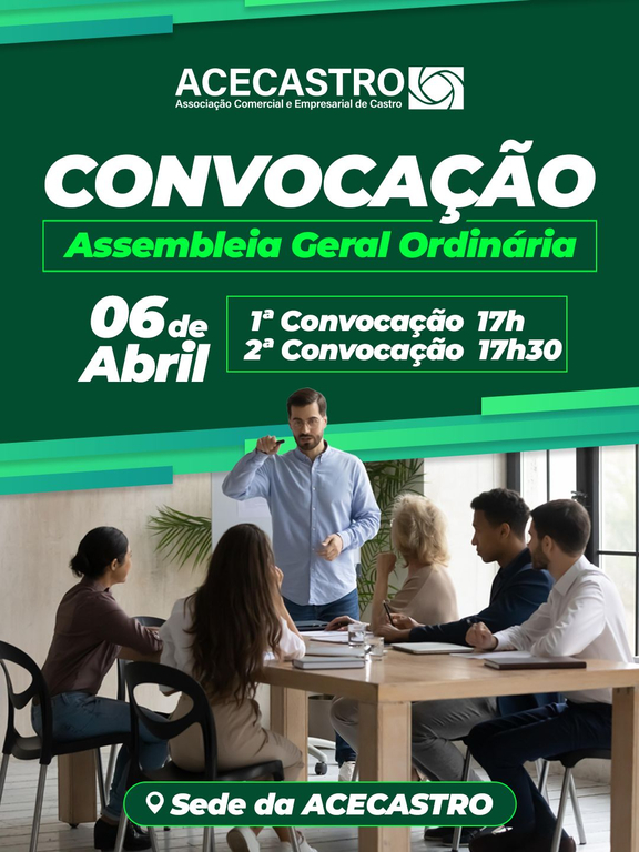 A ACECastro convida todos os associados para participarem da Assembleia Geral Ordinária, que será realizada no dia 06 de abril, na sede da entidade.