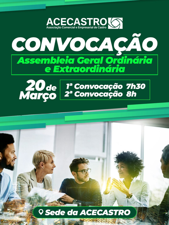 A ACECASTRO – Associação Comercial e Empresarial de Castro convoca todos os seus associados para a Assembleia Geral Ordinária e Extraordinária, a ser realizada no dia 20 de março de 2026.